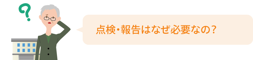 - 建物には各種の消防用設備等が設置されていますが、これらは、平常時は使用されることがないため、いざという時に確実に作動し機能を発揮するかどうかを日頃から確認しておくことが重要です。このため、消防法では、消防用設備等の定期的な点検と消防報告を義務付けています。